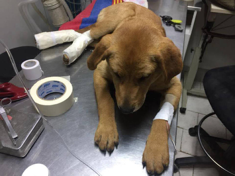 Muchos son los peligros que pasan los animales cuando deambulan sin supervisión en la vía pública, en este caso este cachorrito fue abandonado en la calle, y lo atropelló un taxista, que ni siquiera paró para socorrerlo. Gracias a la empatía de una vecina que vio lo sucedido, ayudó inmediatamente al animalito accidentado y lo llevó a la veterinaria, Patitas como lo bautizamos en ARAF, quedó internado con pronóstico reservado varios días. Luego de hacer varios estudios y placas nos dijeron los profesionales que Patitas tenía fractura de metatarsiano en una pata, y en la otra le faltaba tejido, se le hicieron vendajes y se colocó un tutor en una patita.