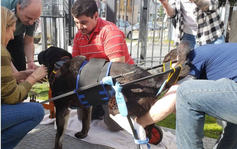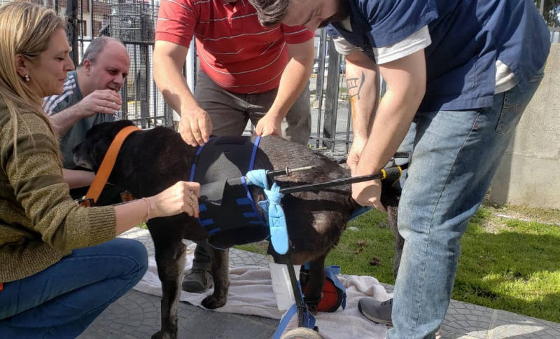 Cuando nos avisaron que ya estaba el PetWheels, nos reunimos en la veterinaria con Negro, era su día de prueba, para ver si podía adaptarse al PetWheels y podía dar sus primeros pasos. Cuando logramos ponerle el carrito, se nos llenaron los ojos de lágrimas al ver la mirada de agradecimiento de Negro, su alegría era increíble. Negro se adaptó y volvió a cambiar su vida. Daniel se hizo cargo de todas las curaciones diarias y ARAF costeó el PetWheels. Negro ya no pudo continuar con sus patrullajes, pero fue feliz al poder caminar de nuevo. y saber que pod{ia contar con todos los Policias, sus amigos.